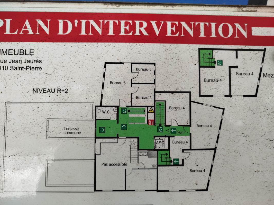 St-Pierre, à moins de 2 minutes de la 4 voies, bureau de 3 pièces dont 1 grande pièce de 19.40 m² + 2 bureaux de 11.70 m² + 8.21 m², situé au dernier niveau dans immeuble avec ascenseur (accès et sanitaire PMR). Vous aurez la possibilité d'accéder à la terrasse couverte commune avec jolie vue montagne, aux sanitaires communs, cuisine commune, un espace salle de réunion à raison de 8h/semaine. Disponible d'ici mois de décembre, voir même avant. - Loyer TTC : 1491.40 €, dont : * TVA : 95.30 € * charges communes : 274.90 € - Dépôt de garantie : 2 mois de loyer - Honoraires de location : 2983.00 € MVS ORPI : 02.62.51.74.74