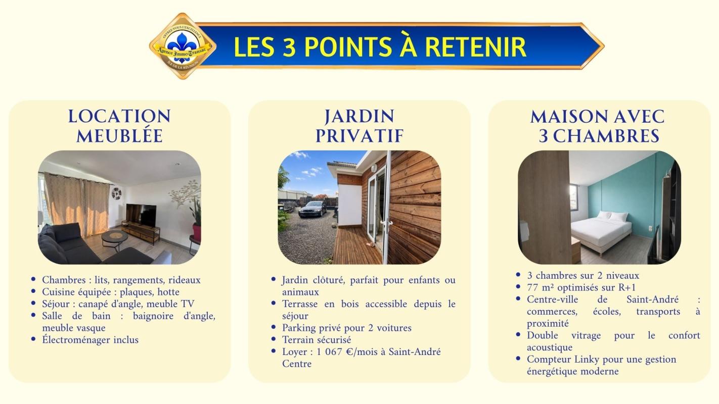 RARE à SAINT-ANDRÉ CENTRE : Maison MEUBLÉE R+1 de 77 m² avec JARDIN PRIVATIF et PARKING pour 2 véhicules -- à moins de 1 100 € par mois. Un bien prêt à vivre, fonctionnel et confortable, pensé pour une vie quotidienne agréable dans un secteur central et pratique. . Cette maison bénéficie de : - 3 CHAMBRES MEUBLÉES confortables et prêtes à accueillir immédiatement leurs occupants. - CUISINE ÉQUIPÉE MODERNE avec plaques intégrées et hotte inox. - SÉJOUR LUMINEUX ouvert sur l'extérieur. - JARDIN PRIVATIF CLÔTURÉ avec terrasse bois. - PARKING PRIVATIF pour 2 véhicules minimum. - LOCATION MEUBLÉE prête à vivre immédiatement. . POURQUOI AGIR VITE ? Une maison meublée avec 3 chambres, jardin privatif, stationnement et emplacement central à Saint-André reste un bien recherché sur le marché locatif. . Explorez cette maison dès maintenant en SCANNANT LE QR CODE dans les photos pour un meilleur aperçu. . Pourquoi cette MAISON MEUBLÉE située à SAINT-ANDRÉ CENTRE mérite votre attention ? . MAISON R+1 BIEN ENTRETENUE : Cette maison de 77 m² sur terrain clôturé offre une configuration fonctionnelle, bien tenue et immédiatement habitable. . CUISINE MODERNE ÉQUIPÉE EN L : Plan de travail bois clair, façades noires, plaques intégrées et hotte inox. Un espace pratique et actuel, ouvert sur la pièce de vie pour un quotidien plus fluide. . SÉJOUR LUMINEUX ET CONVIVIAL : Le séjour accueille un canapé d'angle, un meuble TV et bénéficie d'une baie vitrée coulissante ouvrant sur la terrasse. Un espace agréable, baigné de lumière naturelle. . TERRASSE BOIS ET JARDIN PRIVATIF : L'extérieur prolonge naturellement la maison avec une terrasse en bois et un jardin clôturé, idéal pour profiter du plein air en toute tranquillité. . 3 CHAMBRES MEUBLÉES ET PRÊTES : Les trois chambres disposent de lits, de rangements et d'ambiances personnalisées. Réparties sur deux niveaux, elles permettent de préserver le confort et l'intimité de chacun. . SALLE DE BAIN CONTEMPORAINE : Baignoire d'angle spacieuse, carrelage hexagonal bleu-gris, meuble vasque avec miroir intégré et rangements pratiques : un espace pensé pour le confort au quotidien. . PARKING PRIVATIF SÉCURISÉ : Le stationnement sur gravillons permet d'accueillir au minimum 2 véhicules avec un accès direct depuis la rue par une allée bien délimitée. . ÉQUIPEMENTS ET CONFORT : Double vitrage, compteur Linky, tableau électrique aux normes, volets sur toutes les ouvertures : des prestations rassurantes pour une installation sereine. . EMPLACEMENT CENTRAL À SAINT-ANDRÉ : Commerces, écoles et transports se trouvent à proximité immédiate. Un emplacement stratégique pour faciliter la vie de tous les jours dans l'Est de La Réunion. . AVIS DE L'EXPERT Après analyse croisée des caractéristiques du bien : Maison meublée R+1 de 77 m² sur terrain clôturé Jardin privatif, terrasse bois, cuisine équipée et bon niveau de confort général Configuration idéale avec 3 chambres meublées et parking privatif pour 2 véhicules . Verdict : un bien locatif complet, pratique et immédiatement prêt à vivre, avec un vrai équilibre entre confort intérieur, espace extérieur et emplacement central à Saint-André. . CONTACTEZ-NOUS dès maintenant pour découvrir tout le potentiel de cette maison à louer à SAINT-ANDRÉ CENTRE ! Profitez de notre visite vidéo en SCANNANT LE QR CODE dan...