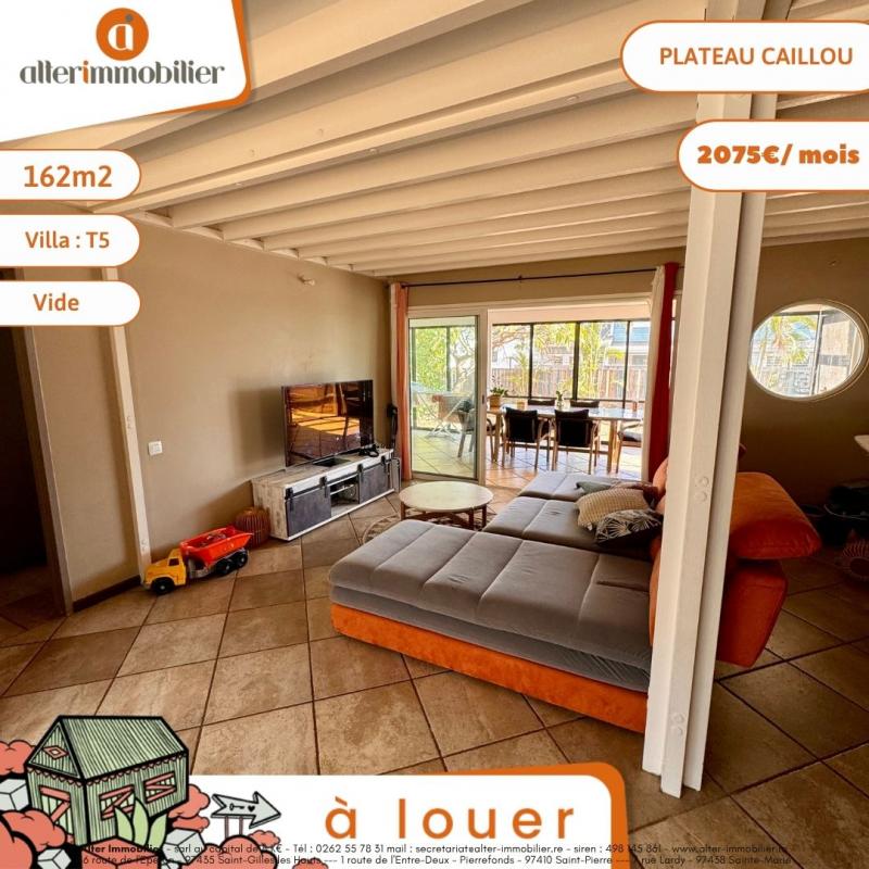 Alter Immobilier vous propose à la location : un bien idéalement placé a Plateau Caillou dans un lotissement calme : Se dresse une Villa duplex de Type 5 Cette villa, répartie sur deux étages, se compose d'une entrée, communiquant sur un séjour, lui même ouvert sur une cuisine semi équipée et d'un cellier. Cet espace lumineux se juxtapose à une large varangue. Le rez-de-chaussée de ce bien se compose également d'une chambre parentale et d'un wc séparé. L'étage de cette charmante villa se constitue quant à lui d'un wc séparé, une salle de bains et de trois grandes chambres supplémentaires. Frais d'agence : 1436,93€ Dépot de garantie : 2002 € Loyer : 2075 € (hors eau et edf) contact : Ugo MENDOLA 0692 54 16 05 / [email protected] Les informations sur les risques auxquels ce bien est exposé sont disponibles sur le site géorisques: https://www.georisques.gouv.fr