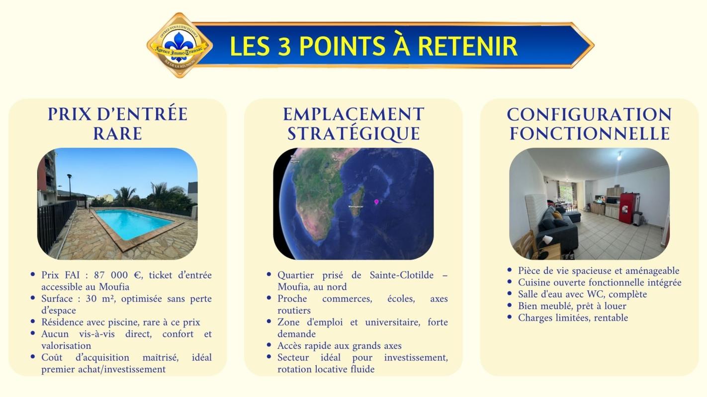 Vous cherchez un STUDIO meublé à vendre à SAINTE-CLOTILDE à proximité de l'université à un prix accessible ? . Cet APPARTEMENT de 30 m² bénéficie de : - RÉSIDENCE avec PISCINE collective, rare à ce niveau de prix - ESPACE DE VIE optimisé, facile à aménager au quotidien - ABSENCE DE VIS-À-VIS direct, pour plus de confort et d'intimité - LOGEMENT VENDU MEUBLÉ, prêt à être occupé ou loué rapidement - EMPLACEMENT STRATÉGIQUE au Moufia, proche commerces, écoles et axes routiers. . Pourquoi ce STUDIO situé au MOUFIA mérite votre attention ? . PISCINE DE LA RÉSIDENCE : La piscine collective constitue un véritable atout de confort et de valorisation. Un équipement recherché, aussi bien pour un usage personnel que locatif. . SÉJOUR AVEC CUISINE OUVERTE : La pièce de vie regroupe séjour et cuisine dans un volume fluide et fonctionnel. Cette configuration optimise chaque mètre carré et facilite l'aménagement. . ENTRÉE ET CUISINE - VUE FRONTALE : L'entrée donne directement sur la pièce principale, offrant une lecture immédiate du volume. La circulation est naturelle et intuitive. . SÉJOUR ORIENTÉ VERS L'EXTÉRIEUR : L'ouverture apporte une LUMINOSITÉ NATURELLE constante et renforce le confort visuel. L'absence de vis-à-vis améliore la sensation d'espace. . SALLE D'EAU FONCTIONNELLE AVEC DOUCHE : La salle d'eau regroupe douche, meuble vasque et WC dans un espace rationnel. Un agencement complet et cohérent pour un usage quotidien. . CONTACTEZ-NOUS dès maintenant pour découvrir tout le potentiel de cet appartement ! Profitez de notre visite vidéo en SCANNANT LE QR CODE dans les photos pour un meilleur aperçu. . Vous avez le projet de VENDRE à l'île de La Réunion ? . Découvrez notre Estimation en ligne GRATUITE en 3 clics. . Grâce à notre EXPERTISE RECONNUE et notre MARKETING INNOVANT, AGENCE IMMO TRANSAC vous aide à vendre vite et au MEILLEUR PRIX. . Monsieur C. HOAREAU : « Merci à l'équipe pour son accompagnement professionnel et sa disponibilité tout au long de notre projet immobilier. » . Offrez-vous l'excellence immobilière à La Réunion avec l'Agence Immo Transac. . Votre Allié Immobilier Réunionnais. . Honoraires à la charge du vendeur. Non soumis au DPE. Les informations sur les risques auxquels ce bien est exposé sont disponibles sur le site Géorisques : georisques.gouv.fr.