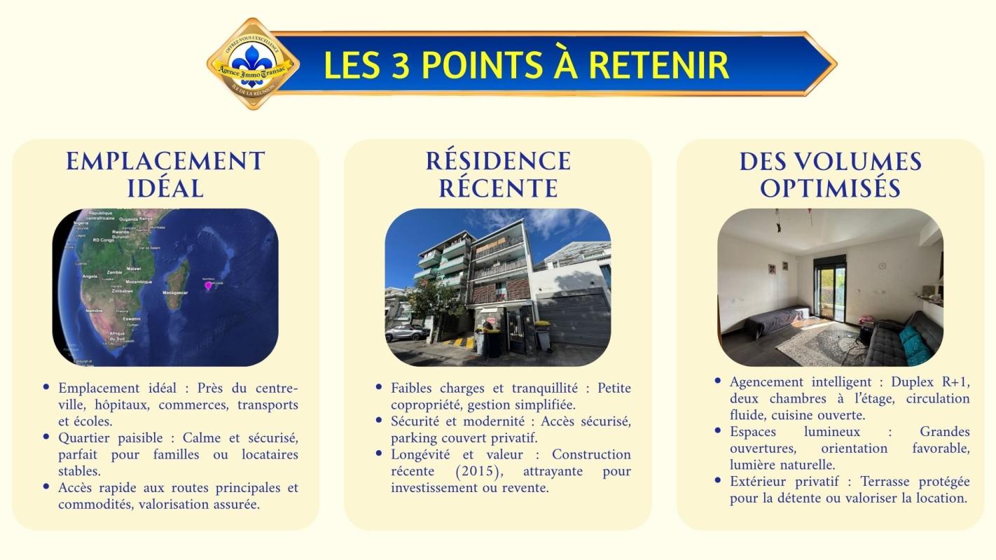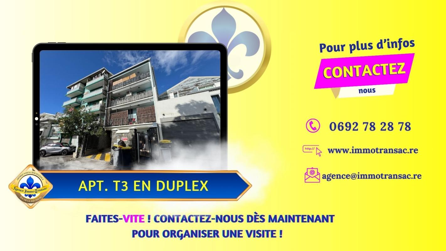 Si vous recherchez un APPARTEMENT à vendre à SAINT-DENIS offrant : - Deux CHAMBRES lumineuses à l'étage. - Une TERRASSE abritée sans vis-à-vis. - Un PARKING couvert et sécurisé. - Une petite copropriété RÉCENTE - Une SITUATION idéale à deux pas des commerces et écoles. . Alors cet appartement situé à Saint-Denis, mérite absolument une visite. Explorez cet appartement dès maintenant en SCANNANT LE QR CODE dans les photos pour un meilleur aperçu. . Parfaite pour un INVESTISSEUR, un couple ou toute personne souhaitant s'installer dans un cadre urbain pratique, cet appartement en duplex de 76 m² répond à toutes les attentes : volumes optimisés, espaces lumineux, extérieur protégé et confort de stationnement. Cette opportunité vous offre la promesse : « Un cadre de vie facile à vivre, au coeur de toutes les commodités ». . EMPLACEMENT PRIVILÉGIÉ - À moins de 3 minutes à pied des commerces et supermarchés. - Écoles et collèges accessibles en moins de 5 minutes à pied. - Arrêt de bus à proximité immédiate, idéal pour tous vos déplacements. - Résidence située à seulement 10 minutes du centre-ville de Saint-Denis. - Fibre optique et internet haut débit disponibles dans l'immeuble. . Découvrez maintenant tous ses atouts, présentés pièce par pièce : . RÉSIDENCE CONTEMPORAINE ET PETITE COPROPRIÉTÉ : Découvrez une petite copropriété moderne, construite en 2015, qui inspire confiance et simplicité, dans le quartier de Montreuil à Saint-Denis. . ACCÈS SÉCURISÉ ET PARKING PRIVATIF : L'accès par portail sécurisé vous permet de stationner votre véhicule dans un parking couvert, réservé aux résidents. . SÉJOUR LUMINEUX AVEC TERRASSE : Le séjour, spacieux et baigné de lumière, s'ouvre directement sur la terrasse extérieure pour un usage convivial au quotidien. . CUISINE OUVERTE INTÉGRÉE : La cuisine ouverte, semi-équipée, favorise les échanges et la préparation des repas tout en profitant de la pièce principale. . TERRASSE ABRITÉE SANS VIS-À-VIS : Une terrasse privative, protégée et sans vis-à-vis, prolonge naturellement l'espace de vie et invite à la détente. . CHAMBRES LUMINEUSES À L'ÉTAGE : À l'étage, deux chambres, dont une mansardée, offrent des espaces intimes baignés de lumière naturelle, idéaux pour le repos ou le télétravail. . SALLE D'EAU MODERNE : Une salle d'eau fonctionnelle, équipée d'une douche et d'un meuble vasque, complète l'espace nuit pour plus de confort. . WC SÉPARÉ POUR PLUS DE CONFORT : Un WC indépendant optimise la fonctionnalité de l'appartement, pour un usage au quotidien facilité. . PARKING SÉCURISÉ : Profitez d'un stationnement couvert et sécurisé, véritable valeur ajoutée dans le centre de Saint-Denis. . PETITE COPROPRIÉTÉ RÉCENTE : Seulement 4 logements dans la résidence, pour plus de tranquillité et de gestion simplifiée au quotidien. . RAFRAÎCHISSEMENT À PRÉVOIR : Quelques travaux de personnalisation permettront de mettre l'appartement à votre goût et de valoriser chaque espace selon vos envies. . CONTACTEZ-NOUS dès maintenant pour découvrir tout le potentiel de cet appartement ! Profitez de notre visite vidéo en SCANNANT LE QR CODE dans les photos pour un meilleur aperçu. . Vous avez le projet de VENDRE à l'île de La Réunion ? Découvrez notre Estimation en ligne Gratuite en 3 clics. . Grâce à notre Expertise Reconnue et notre Marketing Innovant, votr...