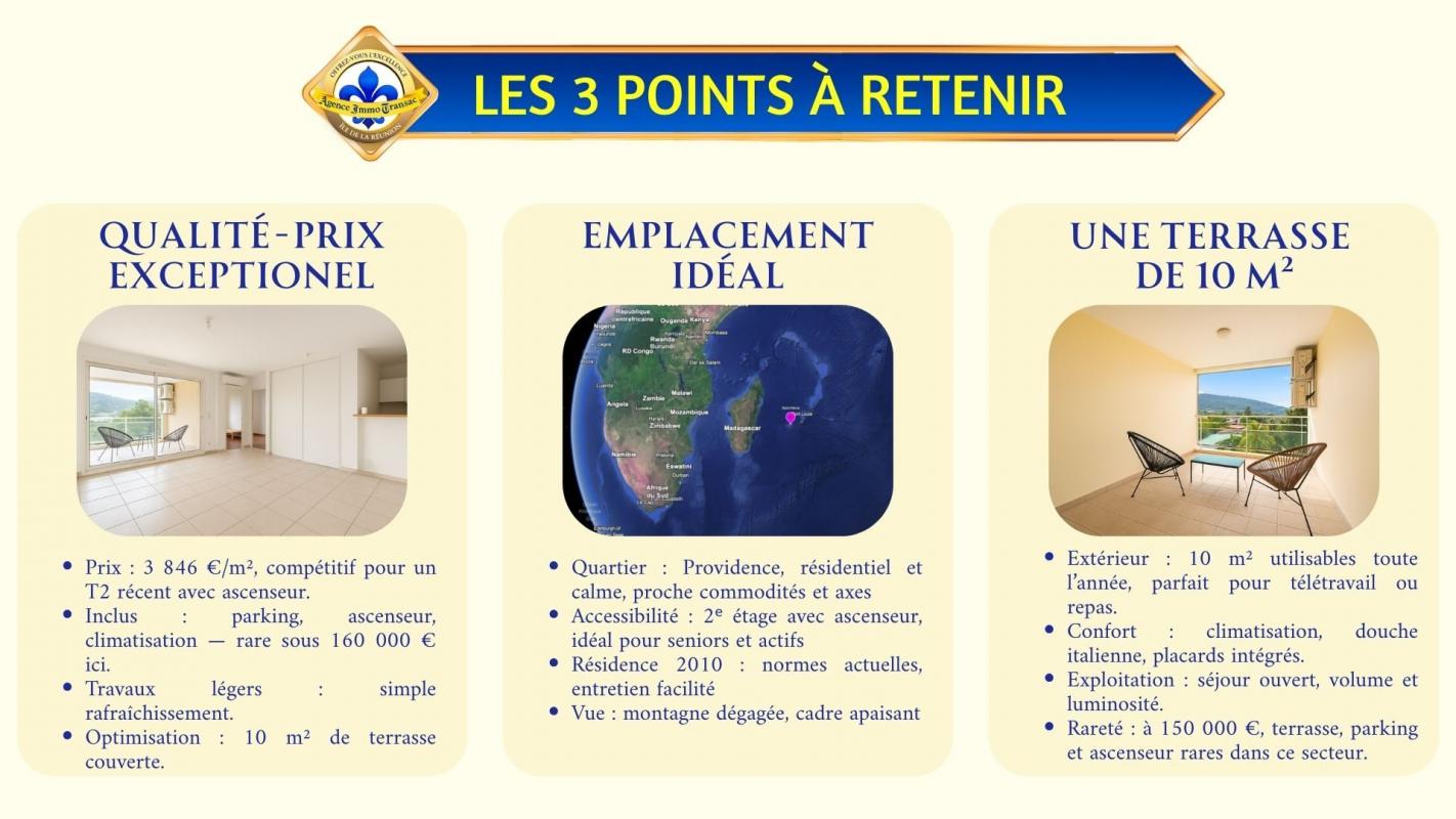 Vous cherchez un APPARTEMENT à vendre à SAINT-DENIS à seulement 150 000€ ? . Cet appartement T2 de 39 m² au 2ème étage avec ascenseur bénéficie de : - TERRASSE privative de 10 m² avec vue montagne. - SÉJOUR lumineux ouvert sur terrasse. - CUISINE ouverte et fonctionnelle. - CHAMBRE de 12 m² avec parquet et rangements. - SALLE D'EAU moderne avec douche italienne. - PARKING privatif inclus. . Explorez cet appartement dès maintenant en SCANNANT LE QR CODE dans les photos pour un meilleur aperçu. . Pourquoi cet APPARTEMENT situé à LA PROVIDENCE mérite votre attention ? . RÉSIDENCE CALME AVEC ASCENSEUR : Deuxième étage dans une résidence bien entretenue. Proximité immédiate des commerces et services du quartier Providence. . TERRASSE 10 M² VUE MONTAGNE : Espace extérieur privatif de 10 m² avec vue dégagée sur les montagnes. Parfait pour vos petits-déjeuners ou soirées détente. . SÉJOUR LUMINEUX OUVERT : Pièce de vie baignée de lumière naturelle avec accès direct terrasse. La continuité fluide entre intérieur et extérieur agrandit l'espace. . CUISINE OUVERTE FONCTIONNELLE : Espace cuisine intégré au séjour pour rester connecté. Aménagement optimisé avec rangements et plan de travail pratique. . CHAMBRE CONFORTABLE 12 M² : Chambre avec parquet authentique et rangements intégrés. Espace nuit calme et bien dimensionné pour un couple. . SALLE D'EAU MODERNE : Douche à l'italienne et meuble vasque contemporain. Finitions récentes et entretien impeccable. . PARKING PRIVATIF INCLUS : Place de stationnement sécurisée dans la résidence. Atout rare à Saint-Denis pour ce prix. . PRIX COMPÉTITIF 150 000€ : Appartement en très bon état, aucun travaux à prévoir. Excellent rapport qualité-prix pour ce secteur recherché. . QUARTIER PROVIDENCE : Commerces, écoles et transports à proximité immédiate. Secteur dynamique et bien desservi de Saint-Denis. . Cet APPARTEMENT T2 à SAINT-DENIS représente l'opportunité parfaite pour un premier achat ou un investissement locatif. . Avec sa terrasse de 10 m², son état impeccable et son prix attractif, il coche toutes les cases pour un achat malin à Providence. . CONTACTEZ-NOUS dès maintenant pour découvrir tout le potentiel de cet appartement ! Profitez de notre visite vidéo en SCANNANT LE QR CODE dans les photos pour un meilleur aperçu. . Vous avez le projet de VENDRE à l'île de La Réunion ? . Découvrez notre Estimation en ligne Gratuite en 3 clics. . Grâce à notre Expertise Reconnue et notre Marketing Innovant, votre Agence Immobilière 974 vous aide à Vendre vite et Au Meilleur Prix. . Madame L. PAYET : 'L'agence Immo Transac a vendu mon appartement en 2 semaines seulement. Professionnalisme et efficacité au rendez-vous. Je recommande vivement.' . Offrez-vous l'excellence immobilière à La Réunion avec l'Agence Immo Transac. Votre Allié Immobilier Réunionnais. Honoraires à la charge du vendeur. Non soumis au DPE. Les informations sur les risques auxquels ce bien est exposé sont disponibles sur le site Géorisques : georisques.gouv.fr.