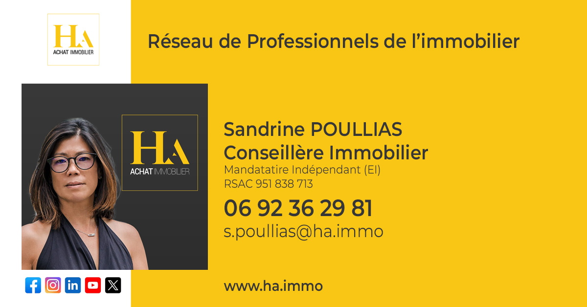 Découvrez la résidence Résidence LENA, en plein coeur de Saint-Denis Nichée en hyper-centre-ville, rue Félix Guyon ,à deux pas de la rue Maréchal Leclerc , la résidence LENA incarne le parfait équilibre entre tranquillité et vie urbaine. Un cadre apaisant, en pleine ville La résidence offre un cadre verdoyant et paisible, idéal pour se détendre après une journée active. Et pourtant, l'essentiel de la ville est à portée de main : commerces, transports, services. tout est là. Des appartements confortables, pensés pour vous Cet appartements T2, avec jardin privatif a été pensé pour répondre aux besoins de chacun. Il dispose d'une douche à l'italienne, d'une cuisine équipée et de la climatisation, pour un confort quotidien optimal. Un investissement serein Grâce à sa localisation privilégiée et à la qualité des prestations, la résidence LENA s'inscrit dans les dispositifs en vigueur pour les programmes neufs. un avantage non négligeable pour les primo-accédants ou les investisseurs. Prix: 410 000 euros TTC HAI Honoraires charge vendeur Mandat n° Pour plus d'informations, vous pouvez contacter : Sandrine POULLIAS Conseillère en immobilier HA IMMOBILIER 06 92 36 29 81 [email protected] Agent Commercial (EI) immatriculée au RSAC de Saint-Pierre de La Réunion n° 951838713 HA IMMOBILIER 4 rue Franck Camille Cadet ZIE Les Sables 97427 L'Étang-Salé Carte professionnelle Transaction n° CPI 9742 2020 000 004 5143, délivrée par la CCI de La Réunion Assurance RCP : MMA IARD, 14 boulevard Marie et Alexandre Oyon, 72030 Le Mans Cedex 9 Plus d'informations sur www.ha.immo Les informations sur les risques auxquels ce bien est exposé sont disponibles sur : www.georisques.gouv.fr SANDRINE POULLIAS (EI) Agent Commercial - Numéro RSAC : 951838713 - Saint Denis de la Réunion.