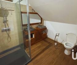 Étage : Un palier pouvant servir de bureau, 2 grandes chambres avec placards (dont une divisible en deux), et une salle de douche avec WC.