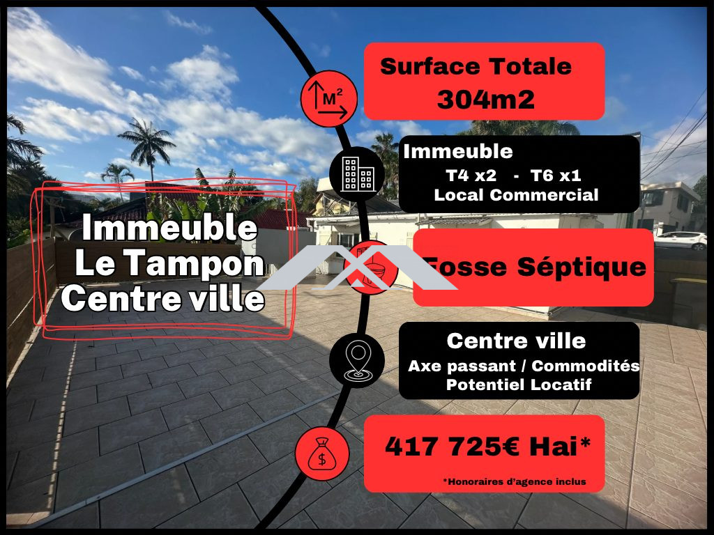 MAXImmo vous propose une propriété d'environ 330 m², divisée en en Trois Lots, un T4 d'environ 66m² ( actuellement Loué 585€/mois CC-jusque 02/27), un T6 d'environ 134m² et d'un local commercial d'environ 133 m² au total. Idéal pour un investissement locatif ce bien, de par sa localisation offre de nombreux avantages. En 5 minutes à pied, vous pouvez atteindre un arrêt de bus qui vous transportera au centre ville du Tampon en moins de 5 minutes. En 15 minutes à pied, vous trouverez des crèches, des écoles maternelles, élémentaires et un collège. Pour les urgences médicales, un hôpital est accessible en 10 minutes en voiture, et un médecin généraliste se trouve à 5 minutes à pied. De plus son positionnement sur un axe très passant offre une visibilité exceptionnelle au local commercial. Ne manquez pas cette opportunité de posséder un bien proposant un rapport locatif confortable. Contactez-nous dès aujourd'hui pour une visite et laissez-vous séduire par cette propriété. Honoraires TTC charge vendeur Mandat n° 13 240 Réseau MAXImmo - Plus d'informations et consultation de nos tarifs sur www.maximmo.re Les informations sur les risques auxquels ce bien est exposé sont disponibles sur le site Géorisques : www.georisques.gouv.fr' Honoraires à la charge du vendeur. Non soumis au DPE. Les informations sur les risques auxquels ce bien est exposé sont disponibles sur le site Géorisques : georisques.gouv.fr. Votre conseiller MAXImmo : Fabrice NICOLAS Agent commercial (Entreprise individuelle) RSAC 79309257800020