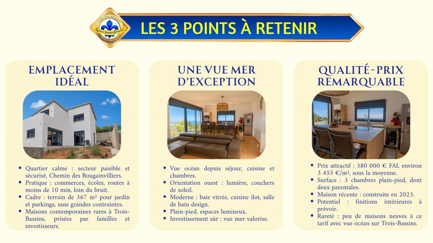 Les Trois Bassins (97426)Si vous recherchez une MAISON à vendre à TROIS-BASSINS offrant : - 3 chambres dont 2 suites parentales. - Un terrain de 367 m² clôturé. - Une VUE MER panoramique. - Un séjour lumineux avec baies vitrées. - Un excellent RAPPORT QUALITÉ/PRIX. . Alors cette maison située à Trois-Bassins, mérite absolument une visite. . Explorez cette maison dès maintenant en SCANNANT LE QR CODE dans les photos pour un meilleur aperçu. . Cette maison vous offre la promesse : « Profiter de la mer au quotidien, dans une maison moderne et fonctionnelle ». . EMPLACEMENT PRIVILÉGIÉ : - À 5 minutes des commerces de proximité - À moins de 10 minutes des écoles et collèges - Accès rapide à la RN1 en 7 minutes - Plages de l'Ouest accessibles en moins de 15 minutes - Vue dégagée sur l'océan Indien. . Découvrez maintenant tous ses atouts, présentés pièce par pièce : . MAISON CONTEMPORAINE DE 110 M² : Cette maison de plain-pied vous offre une organisation claire, trois chambres et des espaces ouverts sur l'extérieur. . VUE MER PANORAMIQUE : Son point fort est indéniablement la vue mer, présente depuis le séjour, la cuisine et les chambres. . GRANDES BAIES VITRÉES : La maison bénéficie de larges ouvertures, renforçant la luminosité et la connexion avec le jardin. . CUISINE OUVERTE AVEC ÎLOT : La cuisine moderne avec îlot central est pratique et conviviale, idéale pour cuisiner en famille. . SÉJOUR LUMINEUX ET OUVERT : Le séjour spacieux profite d'une ouverture directe sur la terrasse et l'océan. . SUITE PARENTALE PRIVATIVE : Une première chambre parentale de 12 m² dispose d'une salle d'eau attenante pour plus d'intimité. . CHAMBRE AVEC TERRASSE ET VUE : La seconde suite parentale de 14 m² s'ouvre sur une terrasse avec vue directe sur la mer. . TROISIÈME CHAMBRE MODULABLE : Une chambre de 12 m² peut être aménagée en espace enfant, bureau ou chambre d'amis. . SALLE DE BAIN MODERNE : L'espace bain comprend une baignoire design et un meuble double vasque contemporain. . SALLE D'EAU SUPPLÉMENTAIRE : Une deuxième salle d'eau complète les équipements, apportant confort et praticité. . WC SÉPARÉS : Deux WC indépendants garantissent une organisation optimale pour le foyer. . STATIONNEMENTS PRIVATIFS : Deux places de parking privatives complètent les prestations de la maison. . TERRAIN CLÔTURÉ DE 367 M² : L'extérieur est prêt à être aménagé, avec potentiel pour terrasse et jardin paysager. . MAISON RÉCENTE 2023 : Construite récemment, elle nécessite encore quelques finitions intérieures comme la peinture ou les faux plafonds. . ÉQUIPEMENTS DE CONFORT : Vous profitez d'un portail motorisé, de volets roulants, d'un chauffe-eau solaire et d'une vidéosurveillance. . CONTACTEZ-NOUS dès maintenant pour découvrir tout le potentiel de cette maison ! Profitez de notre visite vidéo en SCANNANT LE QR CODE dans les photos pour un meilleur aperçu. . Vous avez le projet de VENDRE à l'île de La Réunion ? Découvrez notre Estimation en ligne Gratuite en 3 clics. . Grâce à notre Expertise Reconnue et notre Marketing Innovant, votre Agence Immo Transac vous aide à Vendre vite et Au Meilleur Prix. . Monsieur C. HOAREAU : 'Merci à Monsieur Pitou qui nous a accompagné pour l'achat de notre maison. Il a su être à notre écoute. Il a pris le temps de répondre à nos différentes questions." . O...