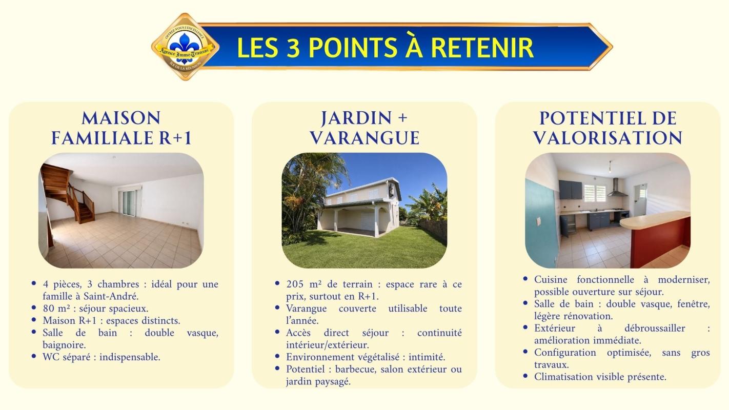 Vous cherchez une MAISON à vendre à SAINT-ANDRÉ avec 3 CHAMBRES et un JARDIN pour votre quotidien ? . Cette maison de 80 m² sur 205 m² de terrain bénéficie de : - 3 CHAMBRES réparties sur 2 NIVEAUX - SÉJOUR avec accès direct au JARDIN - VARANGUE COUVERTE utilisable toute l'année - SALLE DE BAIN avec DOUBLE VASQUE et baignoire d'angle - WC SÉPARÉ avec fenêtre - CLIMATISATION déjà installée dans une chambre. . Explorez cette maison dès maintenant en SCANNANT LE QR CODE dans les photos pour un meilleur aperçu. . Pourquoi cette maison située à SAINT-ANDRÉ mérite votre attention ? . ENTRÉE FONCTIONNELLE AVEC RANGEMENT : Dès l'arrivée, un sas pratique avec PLACARD intégré facilite l'organisation du quotidien. La circulation est simple et fluide vers la pièce de vie. . CUISINE INDÉPENDANTE LUMINEUSE : La cuisine profite d'une FENÊTRE apportant lumière et aération naturelle. Son ouverture sur le séjour permet de garder un lien direct avec l'espace de vie. . SÉJOUR OUVERT SUR LE JARDIN : Le séjour offre un VOLUME agréable à aménager pour créer salon et salle à manger. La BAIE VITRÉE prolonge naturellement la maison vers l'extérieur. . ESCALIER STRUCTURANT EN BOIS : L'escalier organise la maison en R+1 et sépare les espaces jour et nuit. Il structure visuellement le séjour tout en guidant vers l'étage. . VARANGUE COUVERTE PRATIQUE : La varangue crée une véritable pièce extérieure abritée, idéale pour les repas ou moments de détente. Elle prolonge directement le séjour vers le jardin. . TROIS CHAMBRES FAMILIALES : Les 3 CHAMBRES permettent d'accueillir une famille, un bureau ou une chambre d'amis. L'une d'elles bénéficie déjà de la CLIMATISATION pour plus de confort. . SALLE DE BAIN DOUBLE VASQUE : La salle de bain propose une BAIGNOIRE D'ANGLE et un meuble DOUBLE VASQUE. Son volume facilite l'usage quotidien à plusieurs. . WC SÉPARÉ AVEC FENÊTRE : Un WC indépendant apporte plus de praticité au quotidien. La fenêtre assure une AÉRATION naturelle appréciable. . JARDIN DE 205 M² À AMÉNAGER : Le terrain de 205 m² entoure la maison et offre plusieurs possibilités d'aménagement. Coin détente, espace jeux ou jardin paysagé, tout est envisageable. . MAISON R+1 À MODERNISER : L'ensemble repose sur une base saine avec des rafraîchissements à prévoir. Ce potentiel permet d'adapter la maison à vos goûts tout en maîtrisant votre budget. . CONTACTEZ-NOUS dès maintenant pour découvrir tout le potentiel de cette maison ! Profitez de notre visite vidéo en SCANNANT LE QR CODE dans les photos pour un meilleur aperçu. . Vous avez le projet de VENDRE à l'île de La Réunion ? Découvrez notre Estimation en ligne Gratuite en 3 clics. . Grâce à notre Expertise Reconnue et notre Marketing Impactant, AGENCE IMMO TRANSAC vous aide à Vendre vite et au Meilleur Prix. . Monsieur C. HOAREAU : 'Merci à Monsieur Pitou qui nous a accompagné pour l'achat de notre maison. Il a su être à notre écoute et répondre à toutes nos questions." . Offrez-vous l'excellence immobilière à La Réunion avec l'Agence Immo Transac. Votre Allié Immobilier Réunionnais. Honoraires à la charge du vendeur. Non soumis au DPE. Les informations sur les risques auxquels ce bien est exposé sont disponibles sur le site Géorisques : georisques.gouv.fr.