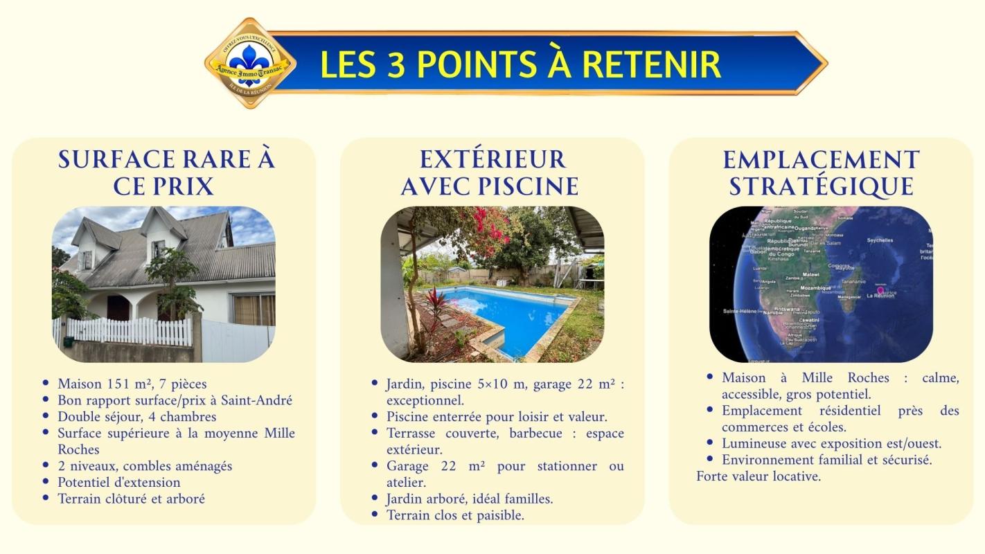 Vous cherchez une MAISON avec piscine à vendre à SAINT-ANDRÉ, dans le quartier résidentiel de MILLE ROCHES, avec JARDIN et PISCINE ? . Cette maison familiale de 151 m² sur un terrain arboré bénéficie de : - 4 CHAMBRES dont une sous combles, climatisée et pleine de charme. - DOUBLE SÉJOUR TRAVERSANT avec arches et baies vitrées sur la terrasse - PISCINE de 5 × 10 m intégrée au jardin. - TERRASSE COUVERTE idéale pour les repas en plein air. - GARAGE fermé de 22 m² et COIN BARBECUE aménagé. . Explorez cette maison dès maintenant en SCANNANT LE QR CODE dans les photos pour un meilleur aperçu. . Pourquoi cette maison située à Mille Roches mérite votre attention ? . ENVIRONNEMENT RÉSIDENTIEL CALME : Nichée dans un lotissement paisible, la maison offre un cadre de vie agréable, à proximité des commerces, des écoles et des axes routiers. Vous profitez du calme tout en restant connecté à la vie quotidienne. . FAÇADE CRÉOLE ET ARCHITECTURE AUTHENTIQUE : La façade typique et la toiture à forte pente rappellent le charme créole, tout en assurant une structure solide et durable. . SÉJOUR LUMINEUX TRAVERSANT : Le double séjour, baigné de lumière, s'ouvre largement sur la terrasse et la piscine. L'organisation fluide des espaces crée une circulation naturelle entre intérieur et extérieur. . CUISINE SEMI-OUVERTE FONCTIONNELLE : La cuisine en L relie harmonieusement la salle à manger et le séjour. Son agencement pratique et sa ventilation naturelle facilitent le quotidien. . CHAMBRES SPACIEUSES ET CONFORTABLES : Quatre chambres de 12 à 17 m², dont une sous combles, offrent confort et intimité. Les volumes généreux s'adaptent à une vie familiale ou à un projet locatif. . SALLE D'EAU ET ESPACES FONCTIONNELS : Une salle d'eau centrale avec fenêtre d'aération et deux WC séparés garantissent praticité et confort au quotidien. . TERRASSE COUVERTE CONVIVIALE : Prolongeant le séjour, la terrasse ombragée permet de profiter des repas en famille toute l'année. . PISCINE 5×10 M : Véritable espace de détente, la piscine s'intègre parfaitement au jardin verdoyant et clôturé. Quelques rafraîchissements permettront de lui redonner tout son éclat. . JARDIN PRIVATIF ET CLÔTURÉ : L'extérieur arboré offre un cadre intime et sécurisant, parfait pour les enfants ou les moments de détente. . GARAGE ET ESPACES COMPLÉMENTAIRES : Le garage de 22 m² permet de stationner ou de créer un espace atelier. Le coin barbecue ajoute une touche de convivialité à vos soirées. . CONFORT ET POTENTIEL : La climatisation partielle assure le confort thermique et les volumes existants offrent un fort potentiel d'aménagement et de valorisation. . CONTACTEZ-NOUS dès maintenant pour découvrir tout le potentiel de cette maison ! Profitez de notre visite vidéo en SCANNANT LE QR CODE dans les photos pour un meilleur aperçu. . Vous avez le projet de VENDRE à l'île de La Réunion ? . Découvrez notre Estimation en ligne Gratuite en 3 clics. . Grâce à notre EXPERTISE RECONNUE et notre MARKETING INNOVANT, votre Agence Immobilière 974 vous aide à VENDRE VITE et AU MEILLEUR PRIX. . Offrez-vous l'excellence immobilière à La Réunion avec l'Agence Immo Transac. . Votre Allié Immobilier Réunionnais. Honoraires à la charge du vendeur. Non soumis au DPE. Les informations sur les risques auxquels ce bien est exposé sont disponibles sur le site Géorisques : g...