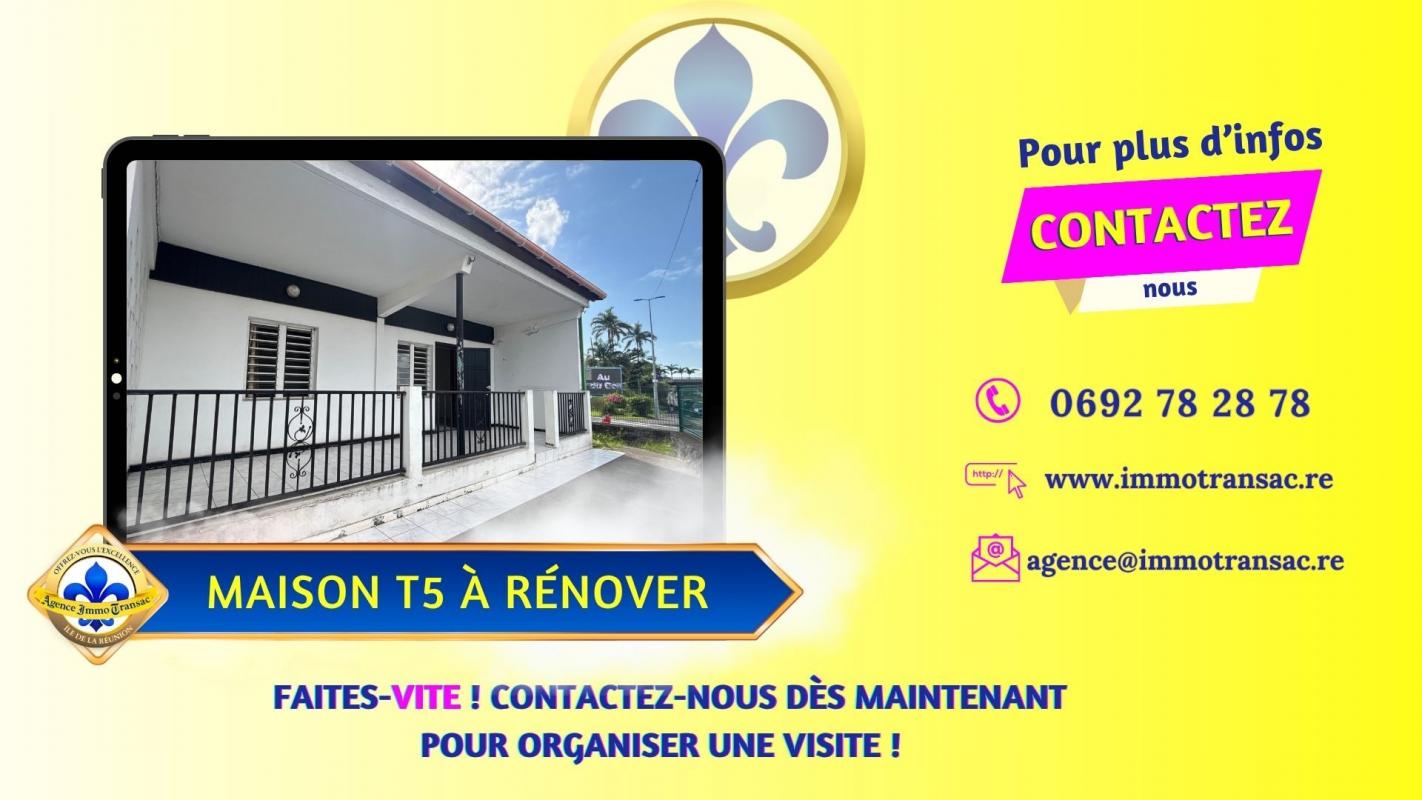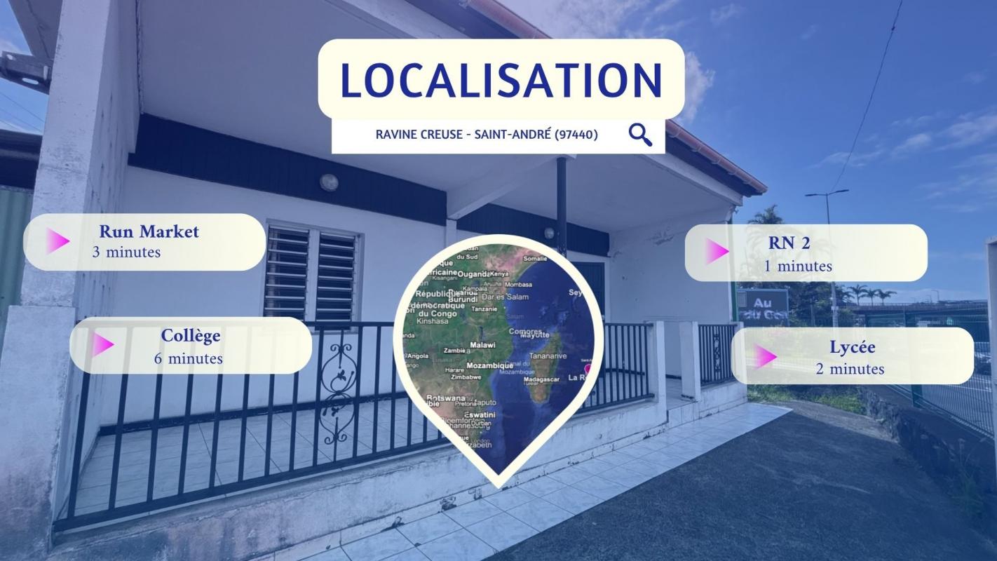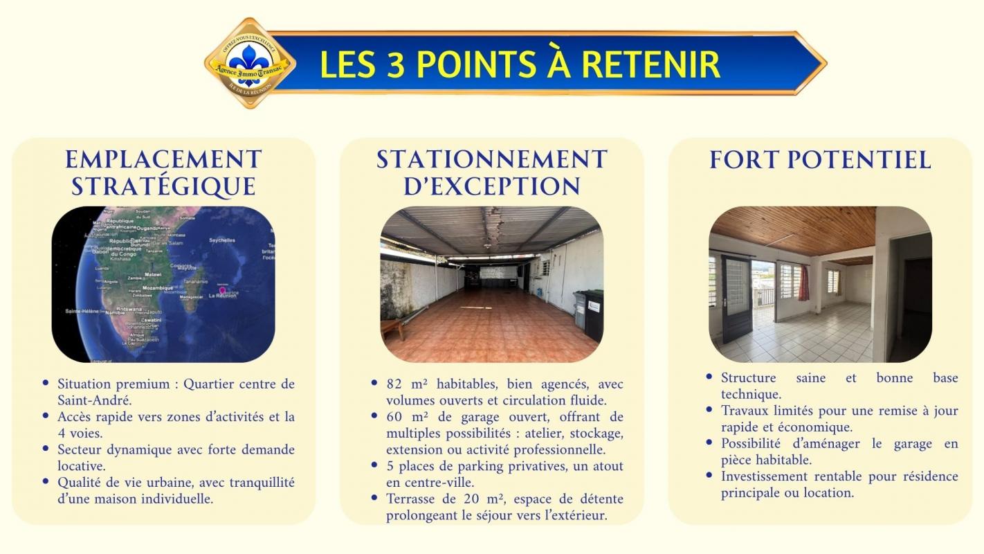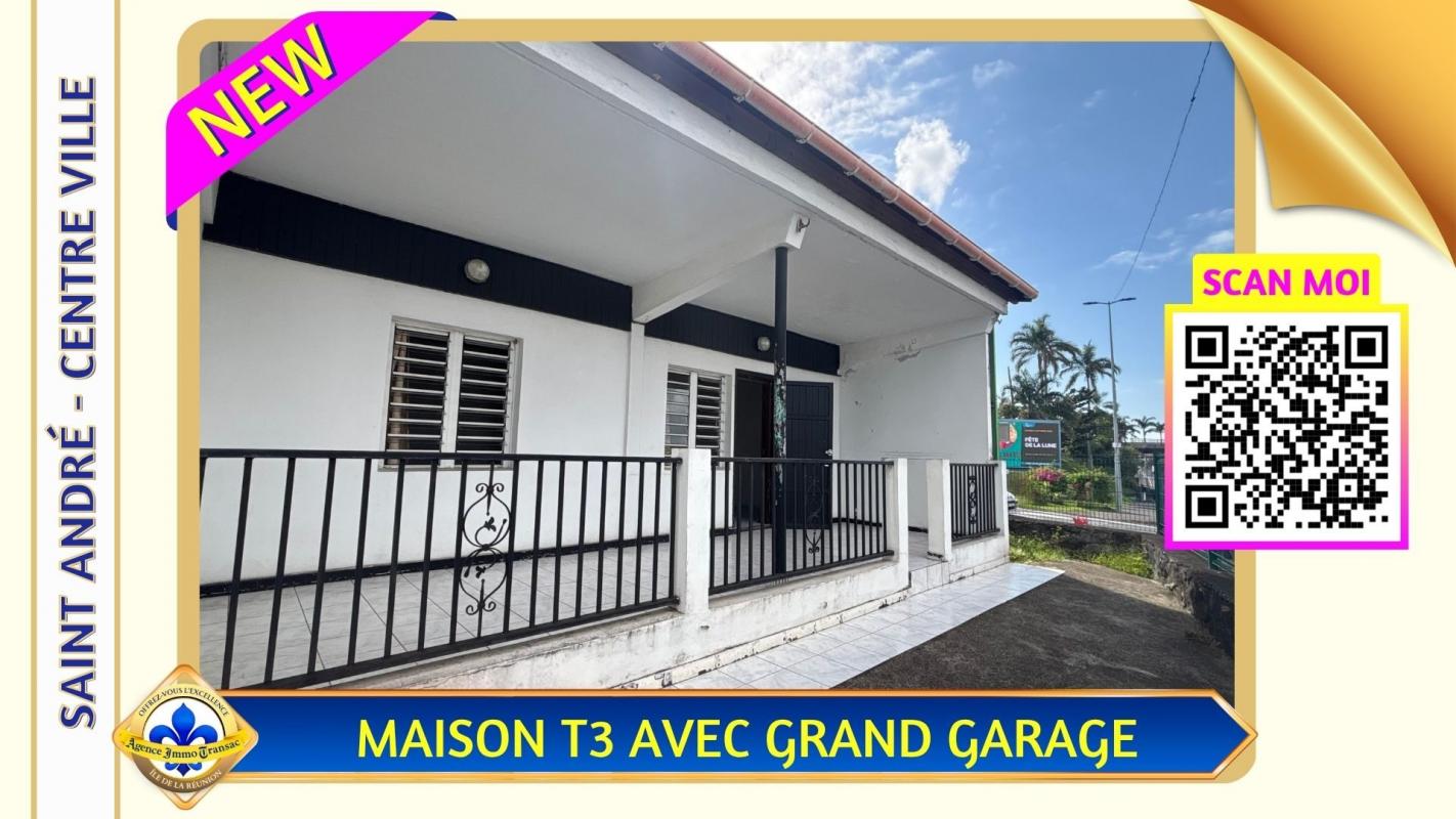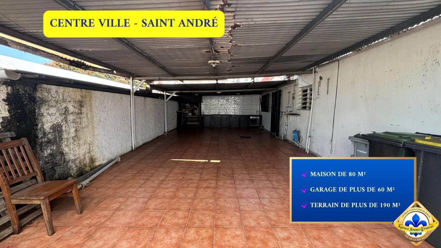 Vous cherchez une MAISON à vendre au CENTRE de SAINT-ANDRÉ, avec un GRAND GARAGE et un fort POTENTIEL d'évolution ? . Cette maison de plain-pied de 82 m² sur un terrain clôturé bénéficie de : - 2 CHAMBRES confortables de 11 et 12 m². - UN SÉJOUR lumineux de 30 m² ouvert sur la TERRASSE. - UNE CUISINE fonctionnelle et contemporaine. - UNE TERRASSE COUVERTE de 20 m² pour vos repas en extérieur. - UN GARAGE OUVERT de 60 m² pour 5 véhicules ou atelier. . Pourquoi cette maison située dans le quartier CENTRE de SAINT-ANDRÉ mérite votre attention ? . ENVIRONNEMENT CENTRAL ET PRATIQUE : Idéalement placée rue de la Gare, cette maison offre un accès direct aux commerces, écoles et transports, tout en conservant la tranquillité d'une maison individuelle. . ESPACE DE VIE LUMINEUX ET FLUIDE : Le séjour traversant de 30 m² séduit par sa LUMINOSITÉ naturelle et sa CIRCULATION fluide. . CUISINE OUVERTE ET MODERNE : La cuisine en L optimise les rangements et les surfaces de travail. . CHAMBRES CALMES ET LUMINEUSES : Deux chambres de plain-pied, entre 11 et 12 m², offrent de beaux volumes et une LUMINOSITÉ équilibrée. . SALLE D'EAU MODERNE ET FONCTIONNELLE : Équipée d'une DOUCHE À L'ITALIENNE et d'un mobilier contemporain, la salle d'eau combine CONFORT et PRATICITÉ. . TERRASSE COUVERTE ET JARDIN PRIVATIF : La terrasse de 20 m² prolonge naturellement la pièce de vie. . GRAND GARAGE ET STATIONNEMENTS : Véritable atout de cette maison, le garage ouvert de 60 m² permet d'abriter plusieurs véhicules, d'aménager un atelier ou un espace de stockage. Jusqu'à 5 places privatives supplémentaires complètent ce confort rare en centre-ville. . ÉTAT GÉNÉRAL ET POTENTIEL : La structure est saine, la toiture en bon état et seuls quelques travaux de rafraîchissement (électricité, peinture) sont à prévoir. . ÉQUIPEMENTS ET CONFORT : Vous profiterez de VOLETS ROULANTS, d'un bon accès INTERNET HAUT DÉBIT et d'un environnement calme à proximité immédiate de toutes les commodités. . CONTACTEZ-NOUS dès maintenant pour découvrir tout le potentiel de cette maison ! Profitez de notre visite vidéo en SCANNANT LE QR CODE dans les photos pour un meilleur aperçu. . Vous avez le projet de VENDRE à l'île de La Réunion ? Découvrez notre ESTIMATION EN LIGNE GRATUITE en 3 clics. . Grâce à notre EXPERTISE RECONNUE et notre MARKETING INNOVANT, votre AGENCE IMMO TRANSAC vous aide à vendre vite et au MEILLEUR PRIX. . Mme S. CARRON : "Un grand merci à l'équipe Immo Transac pour son accompagnement. Professionnalisme, écoute et efficacité jusqu'à la signature !" . Offrez-vous l'excellence immobilière à La Réunion avec l'AGENCE IMMO TRANSAC. Votre Allié Immobilier Réunionnais. Honoraires à la charge du vendeur. Non soumis au DPE. Les informations sur les risques auxquels ce bien est exposé sont disponibles sur le site Géorisques : georisques.gouv.fr.