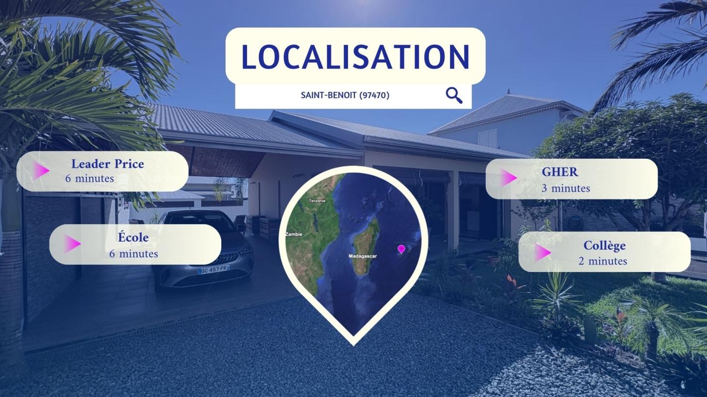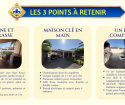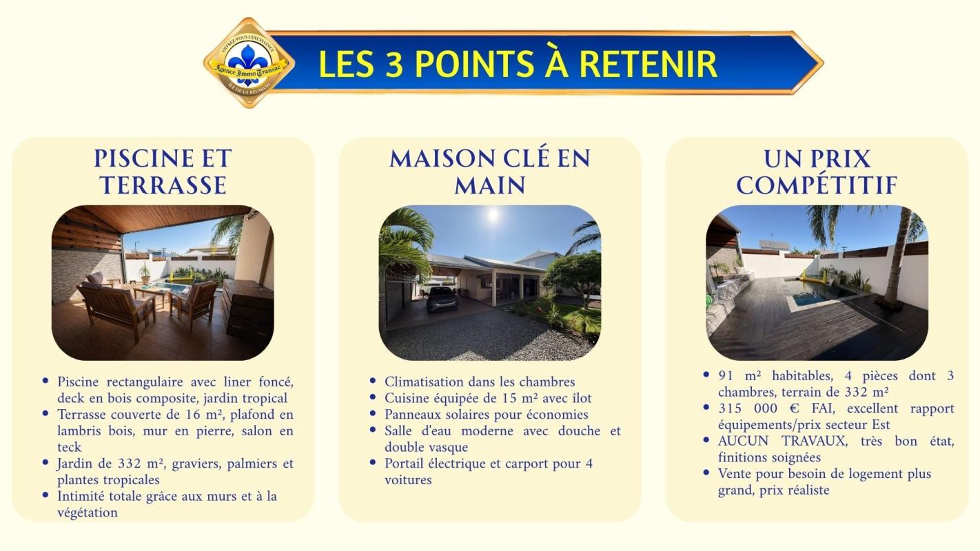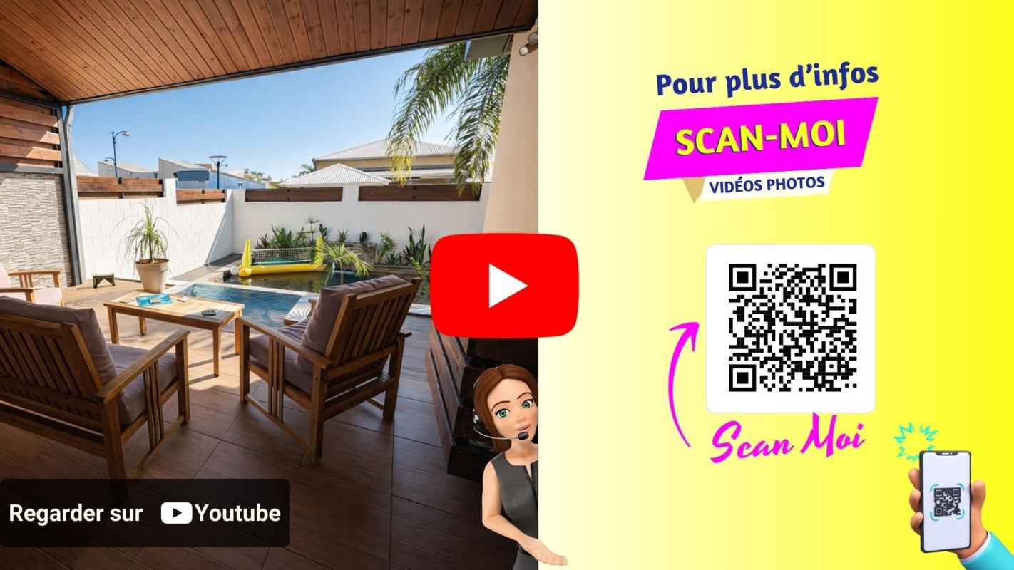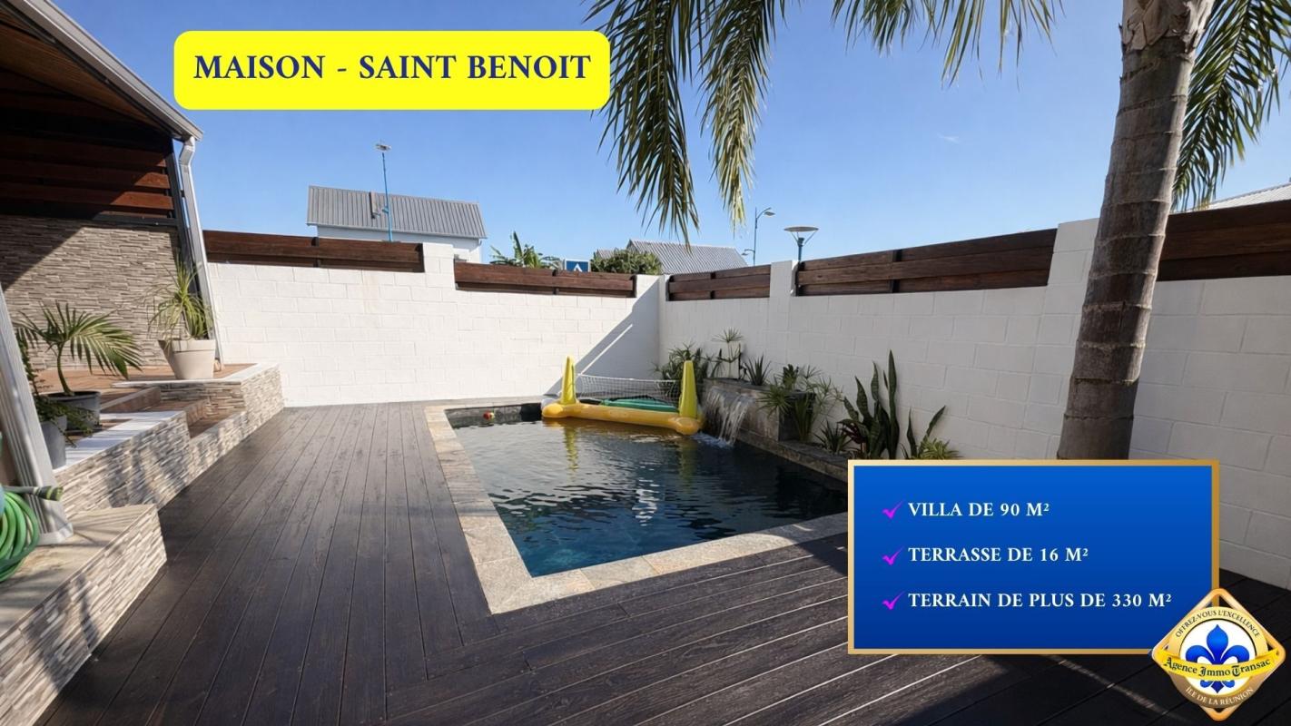 Vous cherchez une MAISON à vendre à SAINT-BENOÎT aux PRESTATIONS HAUT DE GAMME avec PISCINE, GRANDE TERRASSE et un EMPLACEMENT IDÉAL ? . Cette maison de plain-pied de 91 m² sur 332 m² de terrain bénéficie de : - PISCINE privée avec DECK EN BOIS COMPOSITE et liner foncé effet bassin naturel. - TERRASSE COUVERTE de 16 m² avec PLAFOND LAMBRIS BOIS, PAREMENT PIERRE NATURELLE et SALON EN TECK MASSIF. - CUISINE ÉQUIPÉE de 15 m² avec ÎLOT BAR, CRÉDENCE MÉTRO NOIR et plan de travail bois. - 3 CHAMBRES CLIMATISÉES avec splits individuels. - SALLE D'EAU haut de gamme : DOUCHE ITALIENNE, SOL GALETS NATURELS et DOUBLE VASQUE. - EMPLACEMENT PREMIUM : école, collège, commerces et hôpital à proximité immédiate. - PANNEAUX SOLAIRES installés sur la toiture. . Explorez cette maison dès maintenant en SCANNANT LE QR CODE dans les photos pour un meilleur aperçu. . Pourquoi cette MAISON située à SAINT-BENOÎT mérite votre attention ? . TERRASSEFACE PISCINE : Varangue couverte de 16 m² avec PLAFOND EN LAMBRIS BOIS, mur en PAREMENT PIERRE NATURELLE et SALON EN TECK MASSIF. Vos dîners en famille face au bassin, toute l'année. . PISCINE PRIVÉE AVEC DECK BOIS : Bassin rectangulaire avec LINER FONCÉ effet naturel, entouré d'un DECK EN BOIS COMPOSITE soigné. Un luxe quotidien à partager sous le soleil de L'Est de La Réunion. . CUISINE DE STANDING DE 15 M² : Agencement en L avec ÎLOT BAR, CRÉDENCE MÉTRO NOIR brillant, meubles BLANCS LAQUÉS et plan de travail BOIS. Four encastré, hotte design, lave-vaisselle et micro-ondes intégrés. Un espace généreux pour cuisiner tout en partageant avec vos proches. . SÉJOUR CONTEMPORAIN DE 15 M² : Espace de vie aux finitions soignées avec LUMINAIRES GÉOMÉTRIQUES en métal noir et sol IMITATION BOIS. L'endroit idéal pour vos soirées en famille ou entre amis. . SUITE PARENTALE RAFFINÉE : Chambre de 10,65 m² avec MUR D'ACCENT BRUN CHOCOLAT, DÉCORATION EN HEXAGONES DORÉS et CLIMATISATION SPLIT. Votre refuge au calme après une longue journée. . DEUX CHAMBRES CLIMATISÉES : Deux chambres de 9,8 m² chacune, lumineuses et fonctionnelles, avec CLIMATISATION INDIVIDUELLE et sol IMITATION BOIS. Chaque enfant dispose de son propre espace, confortable été comme hiver. . SALLE D'EAU AUX FINITIONS NOBLES : DOUCHE À L'ITALIENNE avec pommeau pluie, SOL EN GALETS NATURELS, meuble DOUBLE VASQUE suspendu et frise en mosaïque. Un moment de bien-être à chaque début de journée. . EMPLACEMENT À PROXIMITÉ DE L'HÔPITAL DE SAINT-BENOÎT : École primaire et collège accessibles à pied, commerces et supermarché U Express à quelques minutes, centre commercial Beaulieu avec Carrefour à proximité, et hôpital GHER accessible rapidement. Vos enfants marchent à l'école, vous oubliez la voiture au quotidien. . PANNEAUX SOLAIRES INSTALLÉS : Équipement écologique déjà en place sur la toiture en bon état. Des économies concrètes sur votre facture énergétique dès le premier mois. . TERRAIN CLOS ET PAYSAGÉ DE 332 M² : PORTAIL ÉLECTRIQUE, carport couvert, 4 places de parking et abri de jardin. Jardin tropical soigné avec palmiers et graviers décoratifs. Vous rentrez chez vous, le portail se ferme, le monde extérieur s'efface. . ET TOUT CELA À SEULEMENT 315 000 € : Des prestations haut de gamme, un emplacement premium et une maison prête à vivre, sans aucuns travaux. Il ne vous reste plus qu'à poser vos valises. . CONTACTEZ-NOUS dès maintenant pou...