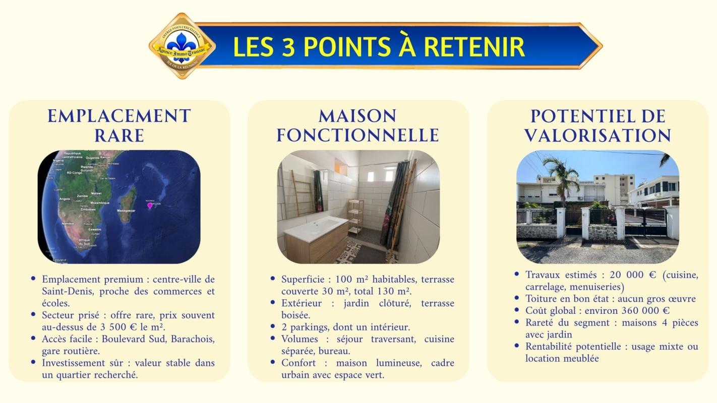 Vous cherchez une MAISON à vendre à SAINT-DENIS, avec TERRASSE COUVERTE et JARDIN à proximité du centre ville à un PRIX EXCEPTIONNEL ? . Cette maison de 100 m² sur 196 m² de terrain bénéficie de : * UNE ADRESSE HYPER-CENTRALE, à proximité immédiate des commerces, écoles et transports. - UN ESPACE DE VIE lumineux et fluide, ouvert sur l'extérieur. - UNE TERRASSE COUVERTE de 30 m². - UN JARDIN clôturé. - 3 CHAMBRES de 10 à 13 m² + un BUREAU indépendant. - 2 PLACES DE STATIONNEMENT. - UN POTENTIEL DE VALORISATION immédiat avec travaux estimés à un peu plus de 20 000 €. . Pourquoi cette MAISON située rue SAINTE-MARIE mérite votre attention ? . JARDIN INTIME ET FONCTIONNEL : Ce jardin latéral de 196 m² offre un espace vert rare, parfait pour créer un coin barbecue ou un espace détente ombragé. . TERRASSE COUVERTE : La terrasse de 30 m² prolonge le séjour, protégée par des claustras en bois qui laissent filtrer la lumière naturelle. . ESPACE DE VIE LUMINEUX : Le séjour s'ouvre largement sur la terrasse, offrant une belle LUMINOSITÉ et une circulation fluide entre intérieur et extérieur. . CUISINE FONCTIONNELLE ET ÉVOLUTIVE : La cuisine indépendante présente un aménagement pratique et une crédence contemporaine, prête à être modernisée selon vos envies. . BUREAU INDÉPENDANT : Un espace calme et lumineux, idéal pour télétravailler ou créer une pièce polyvalente selon vos besoins. . ESPACE NUIT CONFORTABLE : Trois chambres de 10 à 13 m² offrent un cadre intime et modulable, propice à la vie familiale. . SALLE D'EAU RÉNOVÉE : Une salle d'eau moderne avec meuble suspendu effet bois et douche pratique, pensée pour un usage quotidien. . CONFORT DU QUOTIDIEN : Un WC séparé garantit la praticité et l'intimité de la pièce d'eau. . ACCÈS ET STATIONNEMENT PRIVÉ : Une allée fermée permet de garer deux véhicules, un confort rare dans ce secteur recherché. . ÉQUIPEMENTS ESSENTIELS : Climatisation, volets roulants et alarme garantissent confort, sécurité et maîtrise énergétique. . CONTACTEZ-NOUS dès maintenant pour découvrir tout le potentiel de cette maison ! Profitez de notre visite vidéo en SCANNANT LE QR CODE dans les photos pour un meilleur aperçu. . Vous avez le projet de VENDRE à l'île de La Réunion ? Découvrez notre Estimation en ligne Gratuite en 3 clics. . Grâce à notre EXPERTISE RECONNUE et à notre MARKETING INNOVANT, votre Agence Immobilière 974 vous aide à vendre vite et au MEILLEUR PRIX. . Mme S. PAYET : "Une équipe à l'écoute, efficace et transparente. Notre maison a été vendue en moins d'un mois grâce à leur accompagnement." . Offrez-vous l'excellence immobilière à La Réunion avec l'Agence Immo Transac. Votre Allié Immobilier Réunionnais. Honoraires à la charge du vendeur. Non soumis au DPE. Les informations sur les risques auxquels ce bien est exposé sont disponibles sur le site Géorisques : georisques.gouv.fr.