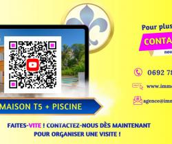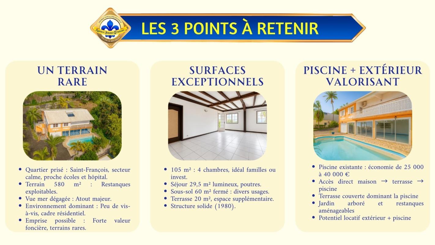 Vous cherchez une MAISON à vendre à Saint-François avec une vue dégagée, une belle surface de terrain et une piscine ? . Cette maison de 105 m² sur 580 m² de terrain bénéficie de : - VUE MER dégagée depuis la terrasse couverte. - 4 CHAMBRES de 12 m² environ, dont 1 au rez-de-chaussée. - SÉJOUR lumineux d'environ 30 m² ouvert sur l'extérieur. - PISCINE attenante à la maison, parfaite pour le quotidien. - SOUS-SOL fermé de 60 m², idéal pour stockage ou atelier. - QUARTIER CALME et végétalisé de Saint-Denis. . Explorez cette maison dès maintenant en SCANNANT LE QR CODE dans les photos pour un meilleur aperçu. . Pourquoi cette maison située dans le quartier de Saint-François mérite votre attention ? . QUARTIER CALME ET VÉGÉTALISÉ : Nichée dans un environnement résidentiel et paisible, la maison bénéficie d'un cadre de vie serein tout en restant proche des commodités. L'ambiance verdoyante qui entoure le terrain renforce la tranquillité des lieux. . SÉJOUR TRAVERSANT LUMINEUX : Le séjour d'environ 30 m² profite de multiples ouvertures qui diffusent une LUMINOSITÉ agréable toute la journée. Cet espace de vie confortable crée une vraie continuité vers l'extérieur pour des moments chaleureux en famille. . TERRASSE COUVERTE EN HAUTEUR : Depuis la terrasse d'environ 20 m², la VUE se dégage sur la végétation et l'espace piscine. Cet espace abrité devient naturellement un lieu privilégié pour les repas ou les instants de détente. . CUISINE FERMÉE FONCTIONNELLE : La cuisine d'une douzaine de mètres carrés offre une organisation pratique du quotidien. L'accès direct vers l'extérieur facilite les allers-retours et rend les repas en famille encore plus fluides. . ESPACE PISCINE CONNECTÉ À LA MAISON : La piscine attenante crée un véritable lieu de vie, pensé pour profiter du climat réunionnais. Son accès direct depuis le séjour et la terrasse en fait un atout rare dans ce secteur. . EXTERIEUR EN RESTANQUES : Le terrain de 580 m² propose plusieurs niveaux exploitables pour jardinage, jeux ou détente. La configuration en restanques crée une variété d'espaces extérieurs à personnaliser selon vos envies. . SOUS-SOL FERMÉ DE 60 M² : Véritable espace polyvalent, il peut servir de stockage, atelier, salle de jeux ou espace aménageable. Un volume rare sur Saint-Denis et particulièrement recherché. . GARAGE ATTENANT PRATIQUE : Le garage facilite le stationnement et le rangement. Son positionnement en façade assure une organisation simple au quotidien. . COIN NUIT BIEN DISSOCIÉ : Quatre chambres de 11,6 à 11,9 m² sont réparties entre le rez-de-chaussée et l'étage. La chambre du bas offre une flexibilité pour recevoir, télétravailler ou créer une pièce indépendante. Les autres chambres profitent d'un environnement calme et lumineux. . SALLE DE BAIN ET WC SÉPARÉ : Une salle de bain fonctionnelle complète l'ensemble, accompagnée d'un WC indépendant pour plus de confort au quotidien. . TERRAIN ARBORÉ ET CLÔTURÉ : Le terrain accueille plusieurs zones ombragées, créant un cadre idéal pour les enfants, les animaux ou les projets extérieurs. L'ensemble est entièrement CLO?TURE?, apportant sécurité et intimité. . TRAVAUX À PRÉVOIR : La cuisine, la salle de bain et la fosse septique nécessitent une rénovation. Le chauffe-eau SOLAIRE assure la production d'eau chaude et la FIBRE est déjà installée. . CONTACTEZ-NOUS dès maintenant pour découvrir...