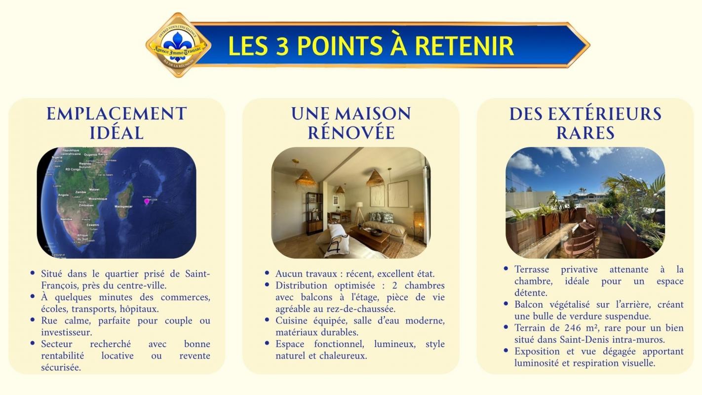 Si vous recherchez une MAISON à vendre à SAINT-FRANÇOIS offrant : - 2 CHAMBRES lumineuses à l'étage. - Un BALCON végétalisé. - Une TERRASSE attenante pour se détendre. - Un INTÉRIEUR de haut standing. - Un PRIX EXCEPTIONNEL avec possibilité VENDUE MEUBLÉE.. . Alors cette maison située dans les bas de SAINT-FRANÇOIS mérite absolument une visite. . Explorez cette maison dès maintenant en SCANNANT LE QR CODE dans les photos pour un meilleur aperçu. . Parfaite pour un COUPLE, une PERSONNE SEULE ou un PRIMO-ACCÉDANT recherchant un bien SANS TRAVAUX, cette MAISON vous offre la promesse : « un cadre de vie urbain, lumineux et bien pensé ». . EMPLACEMENT PRIVILÉGIÉ : - À 5 minutes des commerces et services. - À 7 minutes en voiture du centre-ville de Saint-Denis. - À 10 minutes de l'hôpital Félix-Guyon. - À 3 minutes d'un arrêt de bus. - Vue dégagée sur le quartier résidentiel de Saint-François. . Découvrez maintenant tous ses atouts, présentés pièce par pièce : . MAISON DE 70 M² DE HAUT STANDING : Un intérieur lumineux et fluide, allié à des matériaux de qualité et des extérieurs agréables. . PRIX EXCEPTIONNEL ET PEUT ÊTRE VENDUE MEUBLÉE : Un atout rare pour ce secteur de Saint-Denis, une maison clé en main prête à habiter ou à louer. . BALCON VÉGÉTALISÉ RARE EN VILLE : Un cocon suspendu à l'étage, qui apporte calme et verdure au quotidien. . PIÈCE DE VIE TRAVERSANTE ET LUMINEUSE : Le séjour associe coin salon et salle à manger, avec des matières naturelles et une belle circulation. . CUISINE OUVERTE ET ÉQUIPÉE : Compacte et fonctionnelle, équipée de plaques, hotte et réfrigérateur, parfaitement intégrée au séjour. . SALLE D'EAU AU STYLE MINÉRAL : Douche à l'italienne, finitions soignées, meubles en bois pour une ambiance sobre et élégante. . CHAMBRE PRINCIPALE AVEC BALCON : Lumineuse, calme, avec accès direct au balcon végétalisé. . CHAMBRE SECONDAIRE SPACIEUSE : Spacieuse avec une belle luminosité. . TERRASSE PRIVATIVE ATTENANTE : Accessible depuis la chambre, elle prolonge l'espace de nuit en extérieur. . CONTACTEZ-NOUS dès maintenant pour découvrir tout le potentiel de cette maison ! . Profitez de notre visite vidéo en SCANNANT LE QR CODE dans les photos pour un meilleur aperçu. . Vous avez le projet de VENDRE à l'île de La Réunion ? Découvrez notre Estimation en ligne Gratuite en 3 clics. . Grâce à notre Expertise Reconnue et notre Marketing Innovant, votre Agence Immobilière 974 vous aide à Vendre vite et Au Meilleur Prix. . Monsieur C. HOAREAU : 'Merci à Monsieur Pitou qui nous a accompagné pour l'achat de notre maison. Il a su être à notre écoute. Il a pris le temps de répondre à nos différentes questions.' . Offrez-vous l'excellence immobilière à La Réunion avec l'Agence Immo Transac. . Votre Allié Immobilier Réunionnais. Honoraires à la charge du vendeur. Non soumis au DPE. Les informations sur les risques auxquels ce bien est exposé sont disponibles sur le site Géorisques : georisques.gouv.fr.