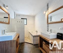 Édifiée sur un terrain plat de 1 680 m², elle dispose d'une piscine, d'un spa, d'un grand parking et d'un local de stockage de 12 m² fermé par un volet roulant électrique.