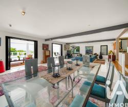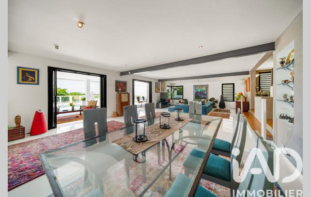 Les 235 m² habitables se déploient avec élégance autour d'un généreux salon-séjour de 70 m², baigné de lumière naturelle. Les baies vitrées à galandage effacent la frontière entre intérieur et extérieur, prolongeant l'espace de vie vers une vaste varangue où se jouent les couchers de soleil sur l'océan.