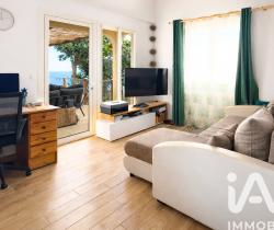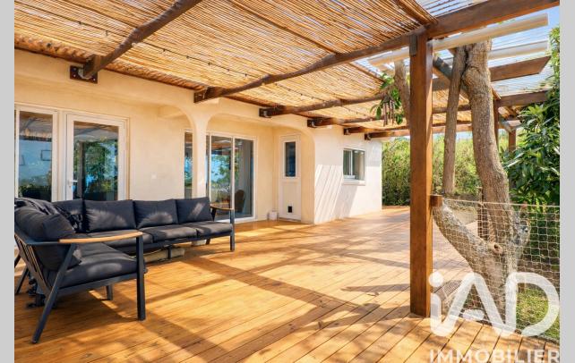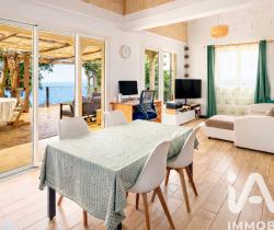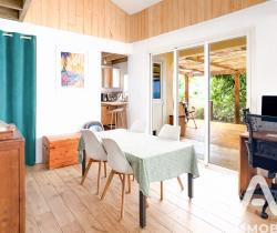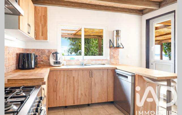 L’espace de vie, lumineux et ouvert sur l’extérieur, se prolonge naturellement par une spacieuse varangue, véritable pièce de vie supplémentaire, idéale pour les repas, la détente et les moments de convivialité, avec la vue mer en toile de fond. La cuisine, séparée, s’intègre harmonieusement à l’ensemble.