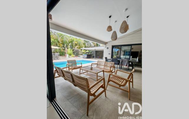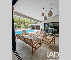 La villa, implantée en 'L', entoure une piscine au sel et une varangue de 29 m².