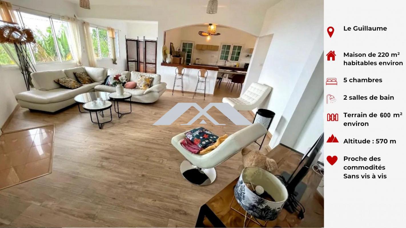 MAXImmo vous propose cette grande maison familiale F6 avec vue mer + T2 indépendant au Guillaume-Saint-Paul. Découvrez cette spacieuse maison d'environ 170 m², située en fond d'impasse, au calme et nichée à 570 m d'altitude dans un cadre verdoyant. Ce bien unique offre des prestations de qualité, une vue mer imprenable et des espaces pour toute la famille. Atouts de la propriété, au rez-de-chaussée : 1 grande cuisine aménagée, ouverte sur un salon-séjour convivial d'environ 59 m², une véranda d'environ 5 m². 1 chambre lumineuse, 1 salle de bain avec wc. Étage : 4 chambres spacieuses (9,20 m² à 17,40 m²), 1 salle de bain avec wc séparé. 1 grande terrasse avec vue dégagée. Attenant à ce bien, 1 T2 indépendant d'environ 53 m² entièrement équipé avec une terrasse privative, parfait pour une location meublée/saisonnière ou pour accueillir vos proches. Équipements et extérieur : un garage fermé d'environ 18 m², un jardin, un chauffe-eau solaire et des panneaux photovoltaïques pour une meilleure économie d'énergie. Situation Idéale : Proche des écoles et commerces, facilitant votre quotidien. À seulement 15 minutes de la route des Tamarins. Taxe foncière : 2 925 €. Cette maison est un véritable coup de coeur, alliant confort et autonomie énergétique. Ne passez pas à côté de cette opportunité rare! Contactez-nous dès maintenant pour organiser une visite ! Honoraires TTC charge vendeur Mandat n° 12749 Réseau MAXImmo - Pour plus de renseignements contactez Grégory au 06 92 01 99 32 ou par mail à [email protected] OU Juliette au 06 92 11 87 45 ou par mail à [email protected] Plus d'informations et consultation de nos tarifs sur www.maximmo.re (réf. 9700811720) Les informations sur les risques auxquels ce bien est exposé sont disponibles sur le site Géorisques : www.georisques.gouv.fr' Honoraires à la charge du vendeur. Non soumis au DPE. Les informations sur les risques auxquels ce bien est exposé sont disponibles sur le site Géorisques : georisques.gouv.fr. Votre conseiller MAXImmo : Grégory CASSEN Agent commercial (Entreprise individuelle) RSAC 790832372