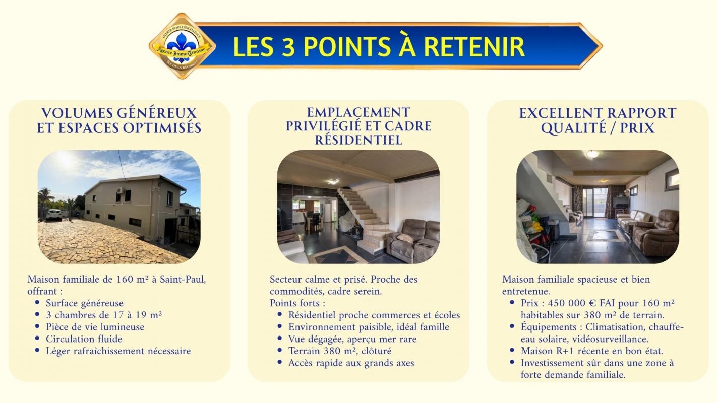 Vous cherchez une MAISON à vendre à SAINT-PAUL dans le quartier recherché de FLEURIMONT ? . Cette maison de 160 m² sur un terrain de 380 m² bénéficie de : - UN SÉJOUR / SALLE À MANGER DE 60 m². - 3 GRANDES CHAMBRES de 17 à 19 m². - UNE PIÈCE DE VIE TRAVERSANTE de 40 m². - UNE CUISINE OUVERTE et fonctionnelle. - 2 WC séparés et 1 salle d'eau avec douche à l'italienne. . Pourquoi cette MAISON située à SAINT-PAUL mérite votre attention ? . LOCALISATION IDÉALE À SAINT-PAUL : Nichée dans un quartier résidentiel recherché de FLEURIMONT, cette maison offre un cadre paisible à quelques minutes des commerces, des écoles et des axes principaux. L'atmosphère y est sereine, idéale pour les familles souhaitant conjuguer confort et proximité urbaine. . SÉJOUR / SALLE À MANGER DE 60 M2 TRAVERSANT ET LUMINEUX : En entrant, la lumière naturelle traverse la pièce principale, révélant un espace fluide et accueillant. La salle à manger attenante crée une continuité parfaite, propice aux repas en famille ou entre amis. . CUISINE OUVERTE ET CONVIVIALE : La cuisine ouverte, spacieuse et bien pensée, permet de cuisiner tout en échangeant avec ses proches. Elle s'intègre harmonieusement à la pièce de vie et facilite la convivialité du quotidien. . ESPACE DE VIE CHALEUREUX : Le salon de belle superficie prolonge la convivialité, avec une ambiance douce et reposante. Sa configuration permet d'aménager un coin détente ou un espace multimédia selon les besoins. . TROIS GRANDES CHAMBRES SPACIEUSES JUSQU'À 19 M² : À l'étage, trois chambres de 17 à 19 m² offrent un véritable confort. Chacune dispose de volumes généreux et d'une luminosité naturelle, idéale pour créer un espace personnel ou un bureau à domicile. . SALLE D'EAU MODERNE ET FONCTIONNELLE : La salle d'eau, équipée d'une douche à l'italienne, se distingue par sa praticité et sa facilité d'entretien. Deux WC séparés viennent compléter les commodités, pour plus de confort au quotidien. . TERRAIN CLÔTURÉ ET FACILE D'ENTRETIEN : L'extérieur carrelé de 380 m² est à la fois pratique et agréable. Parfait pour installer une table familiale, un coin barbecue ou un espace de jeux sécurisé pour les enfants. . CONFORT MODERNE ET SÉCURITÉ : Climatisation installée dans plusieurs pièces, chauffe-eau solaire pour les économies d'énergie, et alarme intégrée pour plus de sérénité. L'ensemble assure un confort de vie durable et performant. . MAISON EN BON ÉTAT GÉNÉRAL : Le bien a été bien entretenu, aucune rénovation structurelle n'est à prévoir. Seules quelques touches de rafraîchissement décoratif permettront de le personnaliser à votre goût. . CONTACTEZ-NOUS dès maintenant pour découvrir tout le potentiel de cette maison à vendre à SAINT-PAUL ! Profitez de notre VISITE VIDÉO en SCANNANT LE QR CODE dans les photos pour un meilleur aperçu. . Vous avez le projet de VENDRE à l'île de La Réunion ? Découvrez notre Estimation en ligne Gratuite en 3 clics. . Grâce à notre EXPERTISE RECONNUE et notre MARKETING INNOVANT, votre AGENCE IMMO TRANSAC vous aide à VENDRE VITE et AU MEILLEUR PRIX. . Monsieur D. BABET : "Une équipe à l'écoute, réactive et professionnelle. Grâce à eux, ma maison s'est vendue dans les meilleures conditions." . Offrez-vous l'excellence immobilière à La Réunion avec l'Agence Immo Transac. Votre Allié Immobilier Réunionnais. Honoraires inclus de 5.88% TTC à la charge de ...