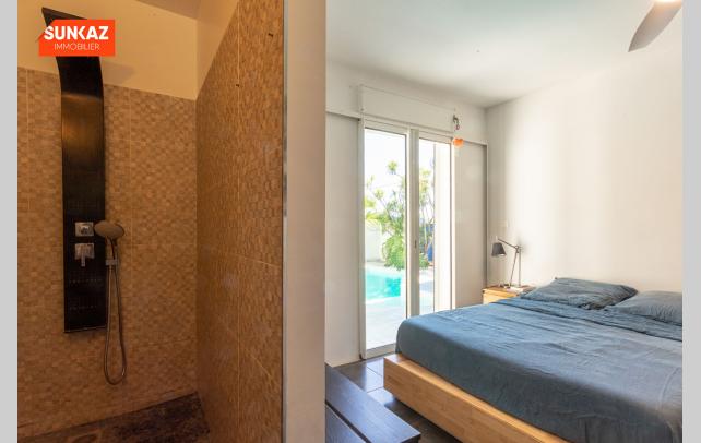 À l'abri des regards, entre verdure et horizon Un petit chemin discret, une allée arborée, et déjà le charme opère. Cette maison se dévoile loin du bruit, dans un cadre intime, à seulement quelques minutes du centre de Saint-Pierre. Derrière le portail, un stationnement privatif vous accueille. Une allée verdoyante mène d'abord à une dépendance aménagée en studio avec mezzanine. Plus loin, la piscine bordée de végétation invite à la détente, en toute tranquillité. La maison principale, elle, s'ouvre sur de beaux volumes baignés de lumière. L'espace jour s'articule autour d'un séjour avec cuisine ouverte. Prolongé par une véranda lumineuse, l'ensemble profite d'une belle vue dégagée vers l'océan. Côté nuit, on découvre trois chambres : une suite parentale avec salle d'eau et dressing, et un espace "enfants" composé de deux chambres communicantes par une salle de bains commune. Le jardin, présent de part et d'autre de la maison, propose différents espaces : jeux, repos à l'ombre ou baignade selon l'envie du moment. Toutes les écoles (primaire, collège et lycée) se trouvent à moins de 700 mètres. Un vrai confort au quotidien pour les familles. Maison de 2011 - surface de 122 m² sur 306 m² de terrain - assainissement tout à l'égout - 1 salle d'eau + 1 salle de bains - cuisine équipée - secteur Terre Sainte. Honoraires à la charge exclusive du vendeur. Les informations sur les risques auxquels ce bien est exposé sont disponibles sur le site Géorisques : www.georisques.gouv.fr Une visite ? Appelez l'agence SUNKAZ au +262 262 490 490.