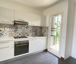 Le logement s’organise au rez-de-jardin, autour d’un plateau de 46 m² comprenant une pièce de vie ouverte, avec espace salon de 25,4 m² et cuisine ouverte de 5,6 m². L’entrée dispose d’un espace modulable sous l’escalier, idéal pour un bureau ou du rangement supplémentaire.