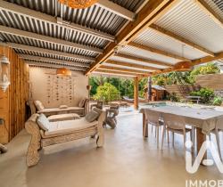 La varangue de 40 m² prolonge l’espace de vie avec une cuisine extérieure complète, parfaite pour les repas entre amis.
