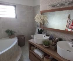 Une salle de bain avec baignoire d’angle, double vasque et WC.