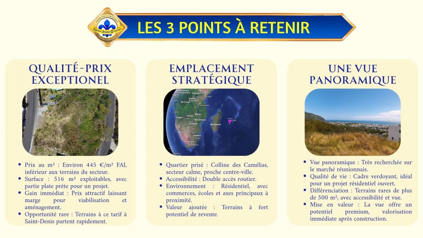 Si vous recherchez un TERRAIN à vendre à SAINT-DENIS, Colline des Camélias, offrant : - Plus de 500 m² exploitables. - Une PENTE douce avec partie plate. - Une DOUBLE ACCESSIBILITÉ routière. - Une VUE panoramique dégagée. - Un PRIX compétitif sous le marché. . Alors ce terrain situé à la Colline des Camélias, mérite absolument une visite. . EMPLACEMENT PRIVILÉGIÉ : - Commerces à proximité immédiate. - Écoles et collèges accessibles en quelques minutes. - Accès rapide aux axes routiers principaux. - Vue dégagée et panoramique depuis la parcelle. . Découvrez maintenant tous ses atouts, présentés pièce par pièce : . TERRAIN DE 516 M² EXPLOITABLE : Cette surface généreuse laisse place à un projet résidentiel ambitieux ou à une construction sur mesure, tout en conservant des espaces paysagers agréables. . DOUBLE ACCÈS ROUTIER PRATIQUE : La parcelle bénéficie d'une double entrée distincte, un avantage rare pour la circulation, la logistique de chantier et la valorisation future. . PENTE DOUCE AVEC PARTIE PLANE : Le relief naturel offre à la fois esthétique et fonctionnalité, permettant de jouer avec les niveaux tout en intégrant une construction harmonieuse. . VUE PANORAMIQUE DÉGAGÉE : Profitez d'un horizon ouvert qui sublime la parcelle et valorise chaque aménagement, un critère recherché sur le marché réunionnais. . ZONAGE UC : Situé en zone UC, ce terrain est idéal pour une construction résidentielle avec des possibilités d'aménagement sur mesure. . DEMANDEZ NOTRE BROCHURE ? RÈGLEMENTS ET PLANS : Pour plus de détails, demandez la brochure en cliquant sur le lien ou en scannant le QR code. Cette brochure complète inclut tous les plans, règlements, coordonnées GPS et bien d'autres informations essentielles pour votre projet de construction. . CONTACTEZ-NOUS dès maintenant pour découvrir tout le potentiel de ce terrain ! Profitez de notre visite vidéo en SCANNANT LE QR CODE dans les photos pour un meilleur aperçu. . Vous avez le projet de VENDRE à l'île de La Réunion ? Découvrez notre Estimation en ligne Gratuite en 3 clics. . Grâce à notre Expertise Reconnue et notre Marketing Innovant, votre Agence Immobilière 974 vous aide à Vendre vite et Au Meilleur Prix. . Monsieur C. HOAREAU : 'Merci à Monsieur Pitou qui nous a accompagné pour l'achat de notre maison. Il a su être à notre écoute. Il a pris le temps de répondre à nos différentes questions." . Offrez-vous l'excellence immobilière à La Réunion avec l'Agence Immo Transac. Votre Allié Immobilier Réunionnais. Honoraires à la charge du vendeur. Les informations sur les risques auxquels ce bien est exposé sont disponibles sur le site Géorisques : georisques.gouv.fr.