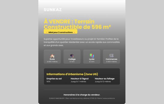 A Bois d'Olive, Joli terrain à bâtir dans un quartier résidentiel. Venez découvrir ce terrain constructible de 596 m² . Sa belle superficie vous offrira un confort de vie exceptionnel, idéal pour réaliser la maison de vos rêves avec un grand jardin, une piscine ou un espace de loisirs extérieur. Idéalement situé, vous bénéficierez d'un accès rapide à toutes les commodités : École à 800 mètres Collège à 1 km Lycée à 2 km Commerces de proximité (primeur, boulangerie, etc.) à 800 mètres. Vous profiterez de la tranquillité d'un quartier résidentiel tout en restant proche des grands axes routiers, facilitant ainsi vos déplacements quotidiens. Potentiel de construction important en Zone UG : Emprise au sol autorisée de 50%, soit plus de 300 m² de surface constructible au sol. Hauteur jusqu'à 7 mètres à l'égout du toit, et jusqu'à 12 mètres au faîtage. Honoraires à la charge du vendeur. Les informations sur les risques auxquels ce bien est exposé sont disponibles sur le site Géorisques : www.georisques.gouv.fr. Ne laissez pas passer cette chance de construire votre avenir sur un terrain spacieux et parfaitement situé. Pour plus d'informations ou pour organiser une visite, n'hésitez pas à nous contacter : 0262 490 490.